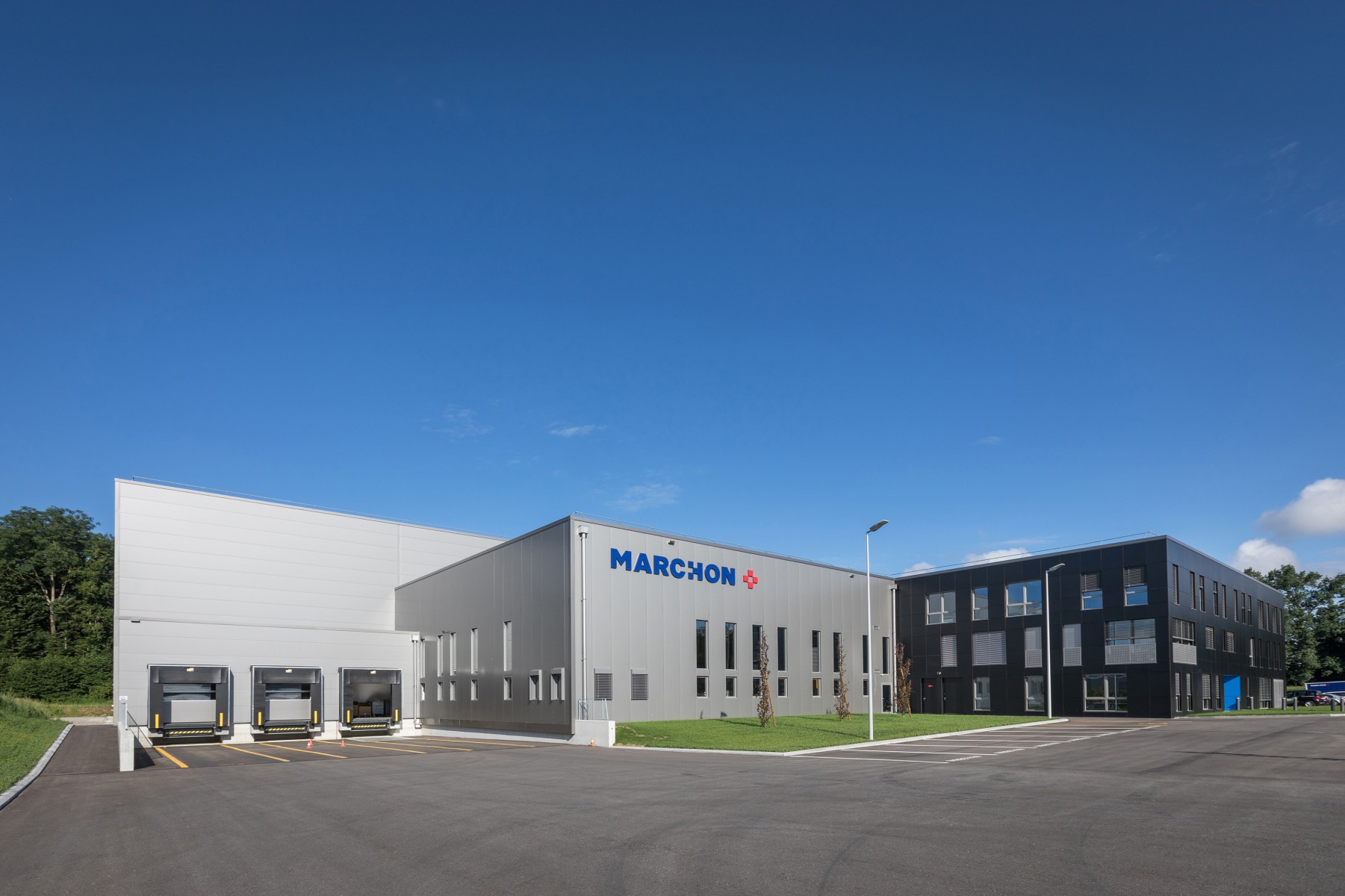 Au premier plan, le bâtiment administratif habillé de FunderMax, panneaux stratifiés compacts noirs. Outre les bureaux, il accueille le showroom et l’appartement de fonction destiné au concierge. Juste derrière, la halle picking dédiée à la préparation et à l’expédition des commandes. Celle-ci intègre une halle mezzanine réservée à la préparation de présentoirs destinés aux clients de l’entreprise, en l’occurrence de grandes enseignes de la distribution, Migros, Coop, Manor, etc. Enfin, la pièce maîtresse se situe à l’arrière-plan, une halle de stockage de cent vingt mètres de long, pour dix milles palettes !