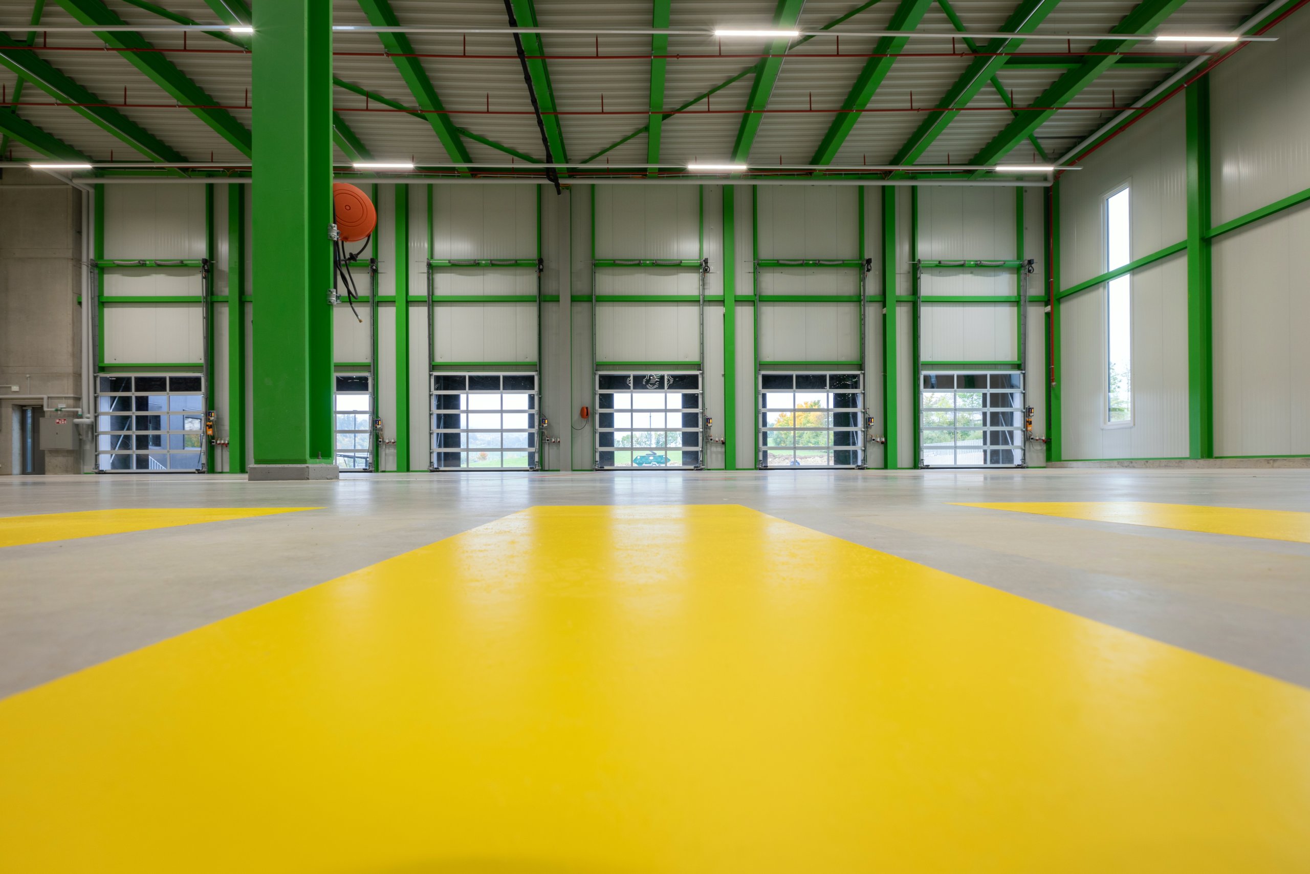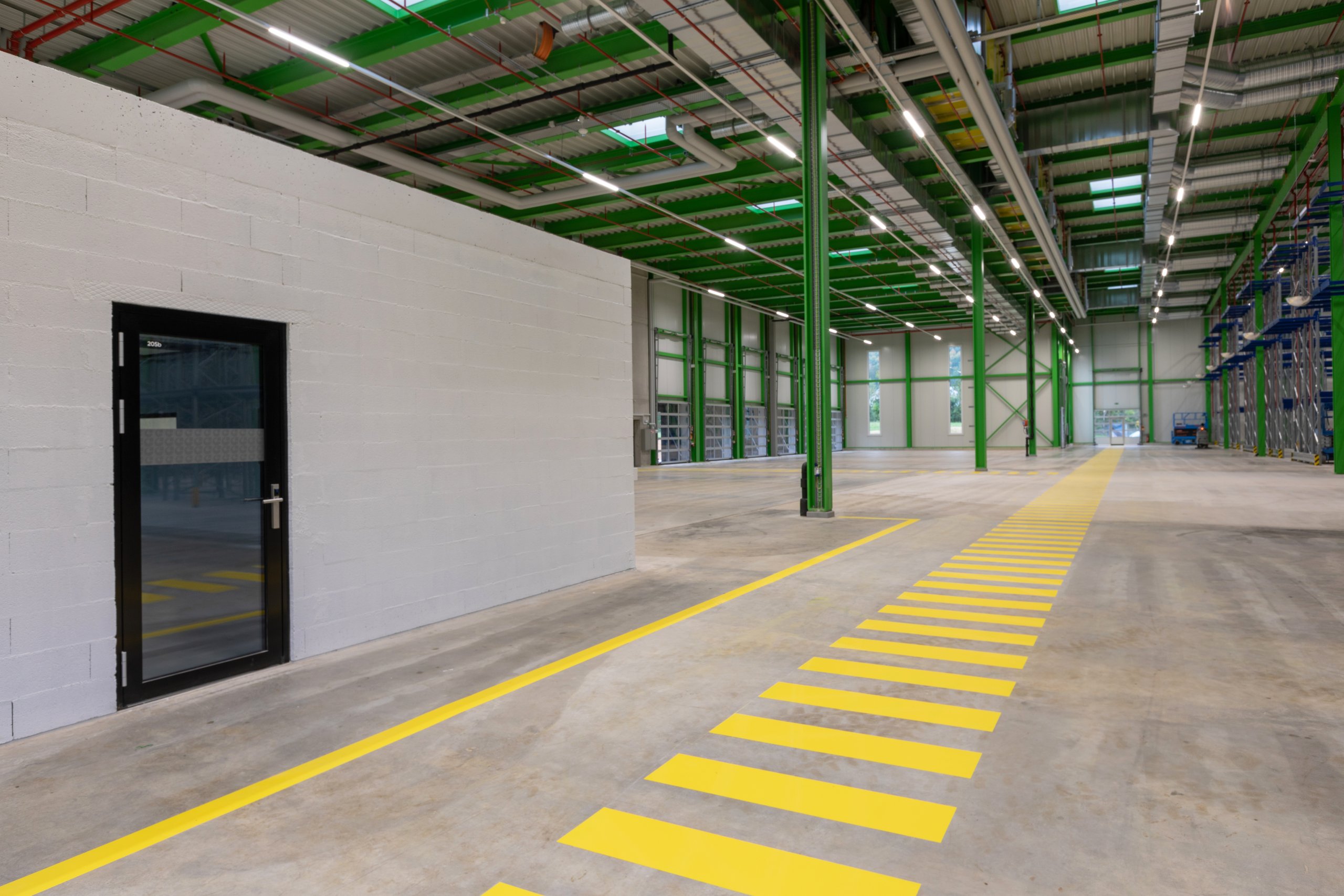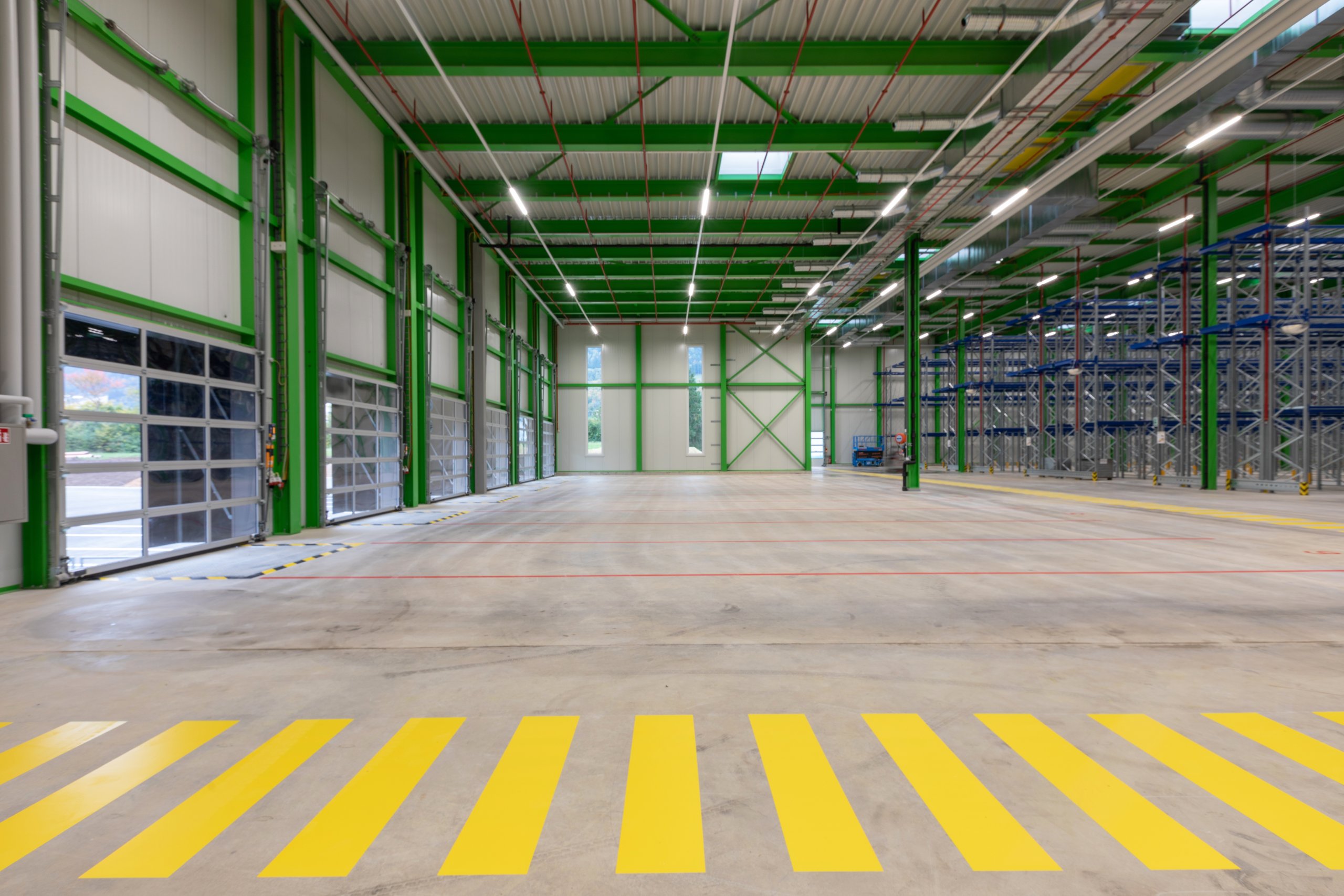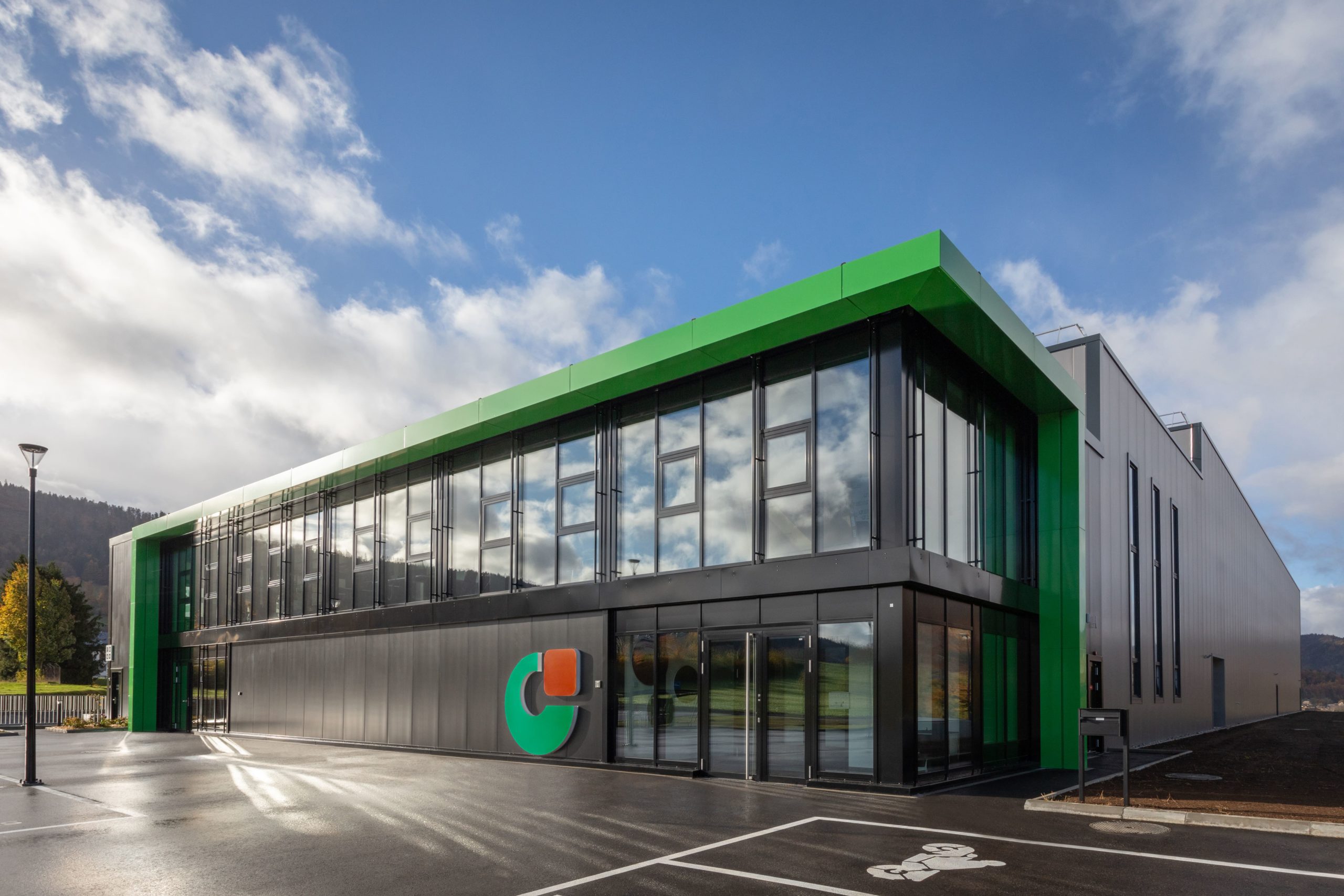 Pour la halle logistique, le dimensionnement de la structure porteuse et les mesures de protection incendie, en particulier le système sprinkler, ont été conçus dans une logique de pérennité, afin de permettre une extension future du bâtiment. Pour la partie administrative, le choix d’une façade en système poteaux-traverses s’est imposé afin d’offrir une qualité de finition élevée, des espaces de travail lumineux et agréables à vivre, ainsi qu’un cadre accueillant et soigné pour recevoir les clients.